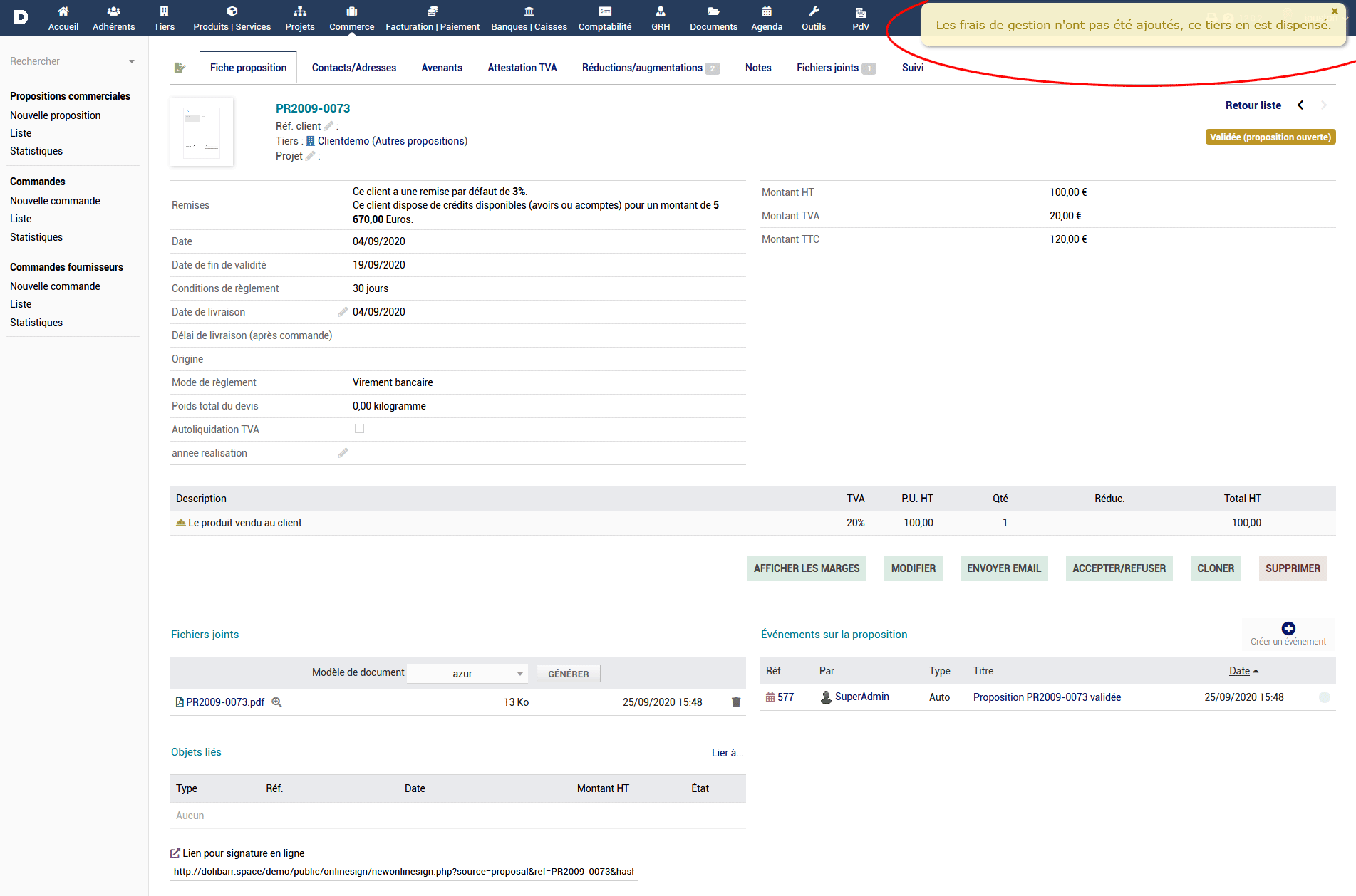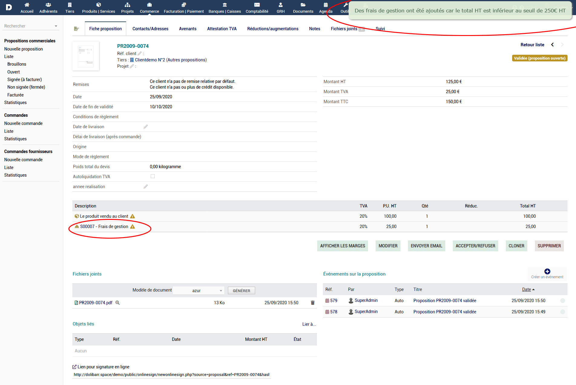 - Le paramétrage du module dolibarr vous permet d’ajouter ces frais de dossier, ou ces frais de gestion selon un seul de tarif que vous définissez.