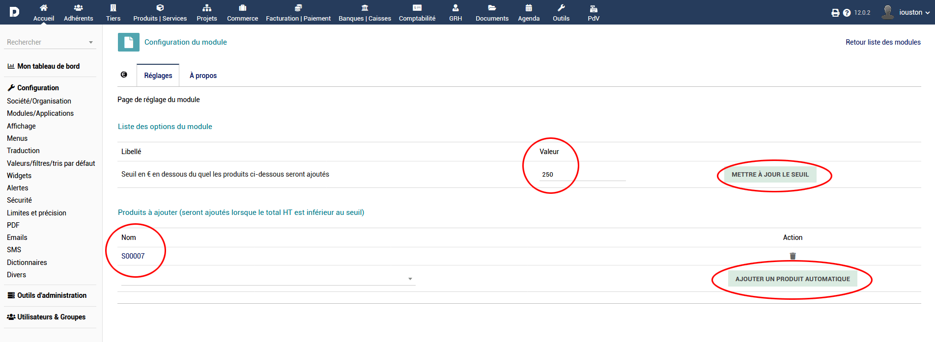 La configuration du module dolibarr « Frais automatiques » vous permet d’ajouter / modifier des produit et/ou des services à ajouter en fonction d’un seul. Vous devez également un seuil en dessous duquel ces frais seront appliqués.